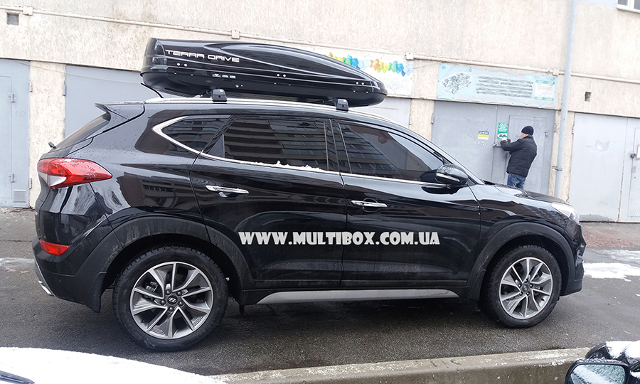 Новой машине, новый автомобильный бокс Terra Drive 480 DS глянец , клиент купил в Киеве на Hyundai Tucson с интегрированными рейлингамии. Поставили турецкие поперечины WinCarrier, не выступающие по краям и на них сверху авто бокс. Получилось даже очень красиво и не дорого.