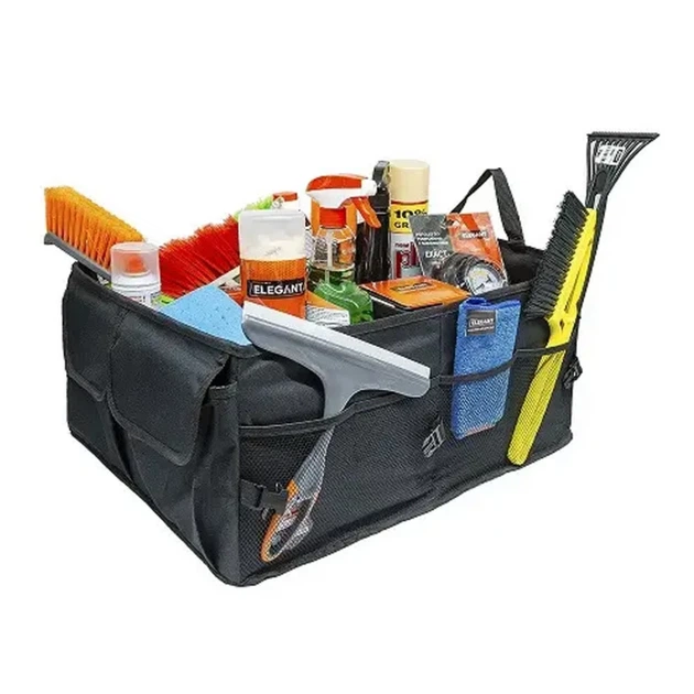 Вместительный автомобильный органайзер с множеством карманов и отделений поможет разместить в одном месте много необходимых в пути вещей.