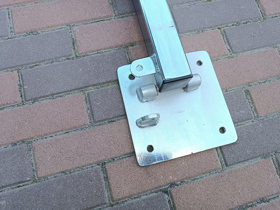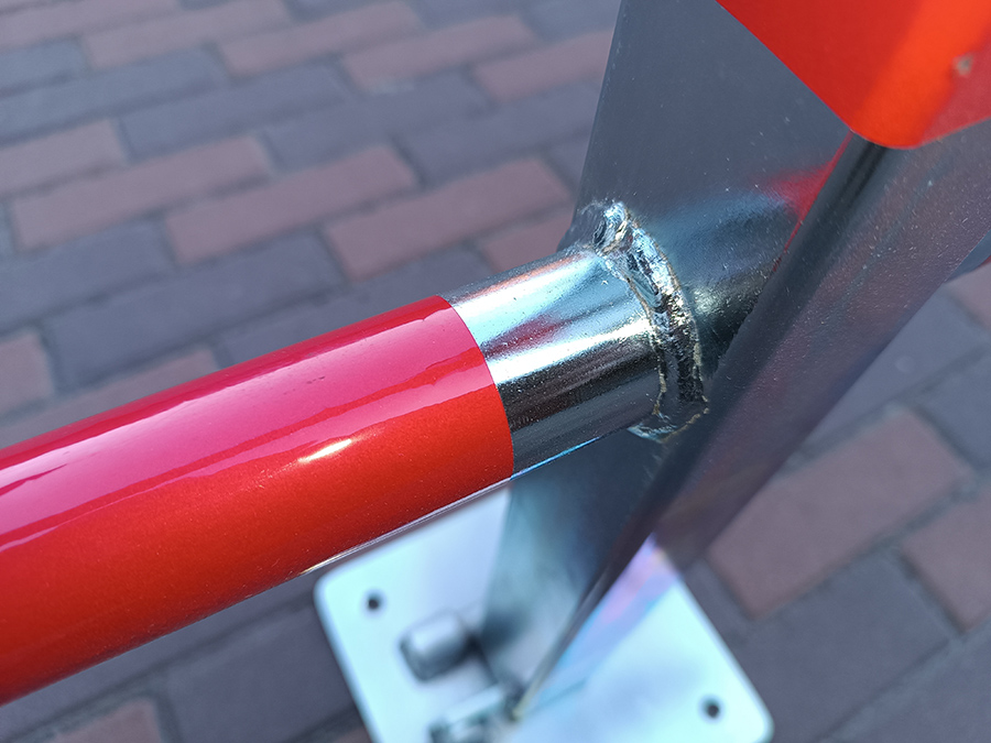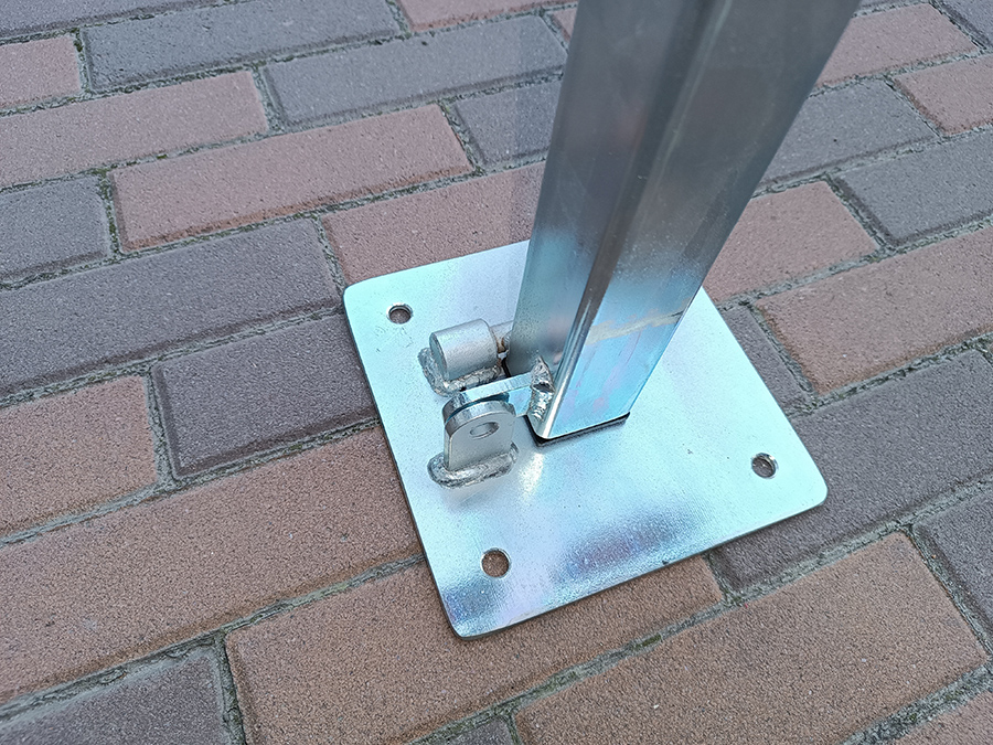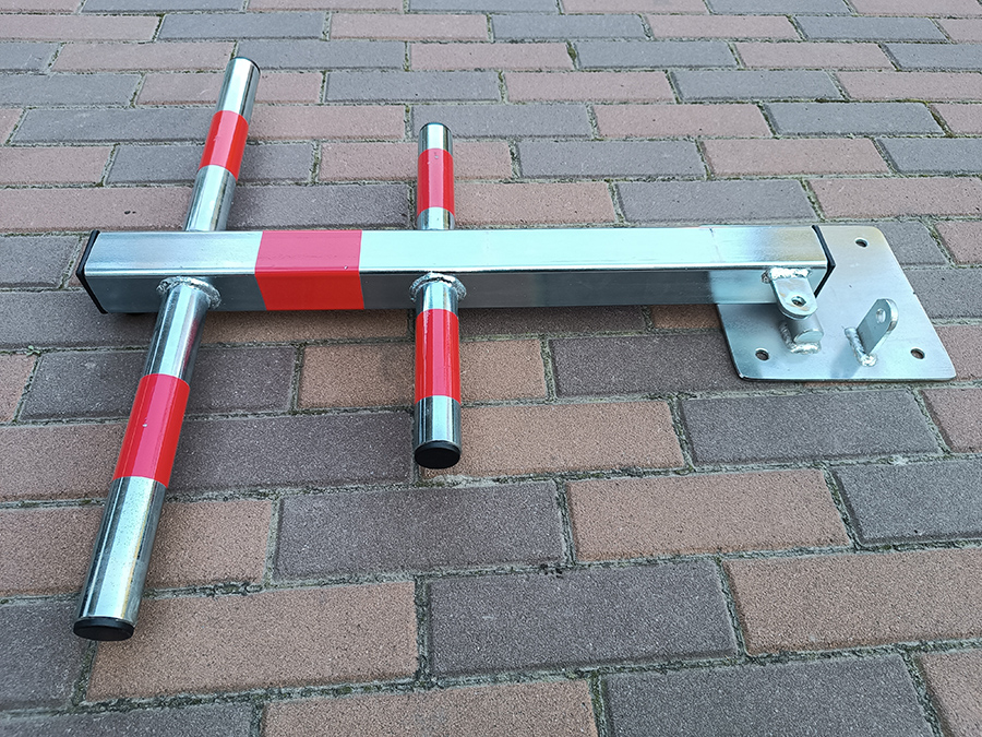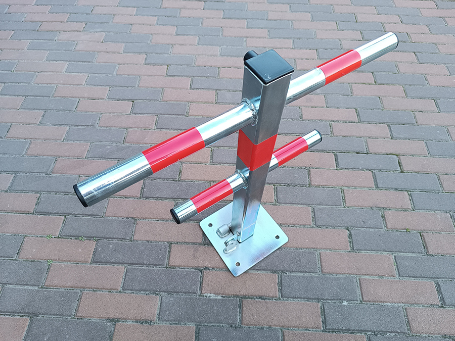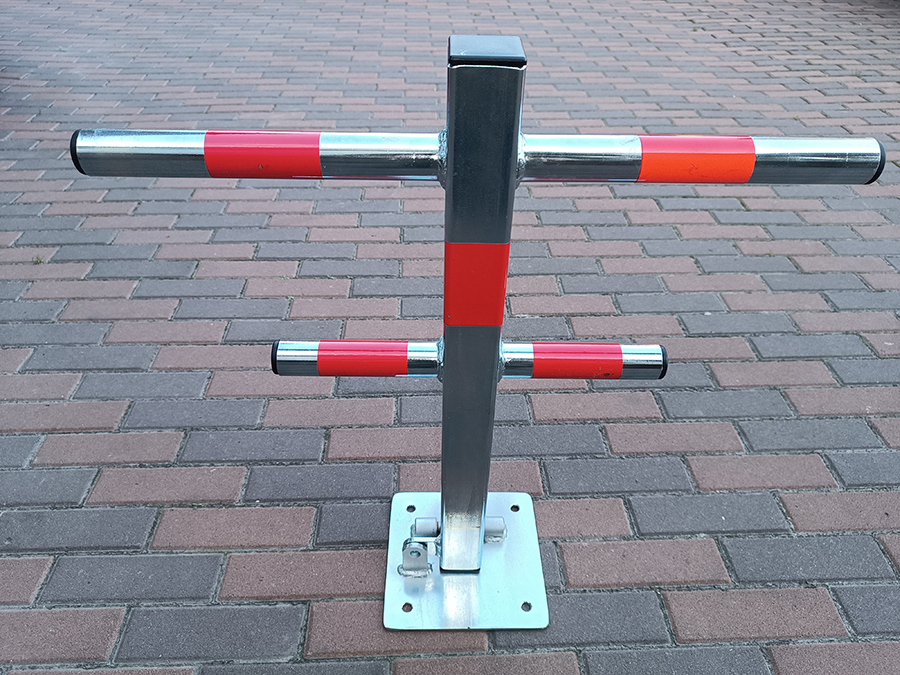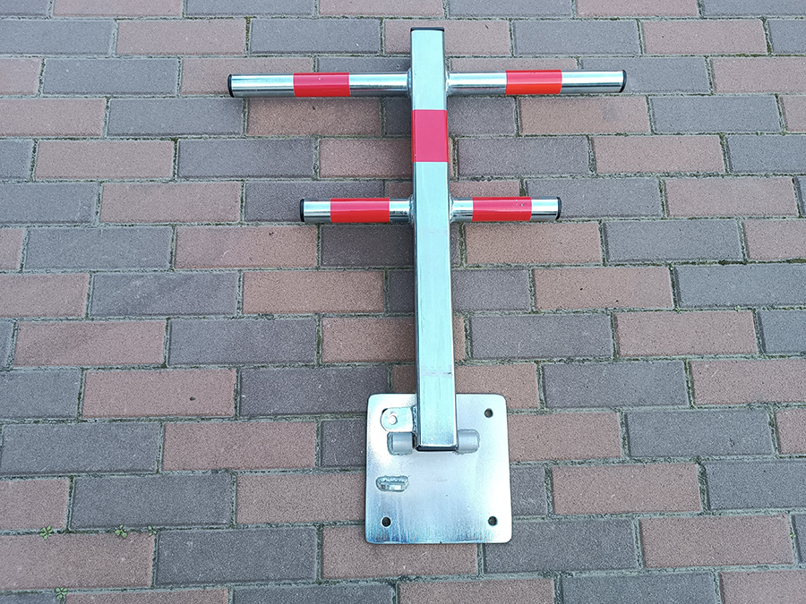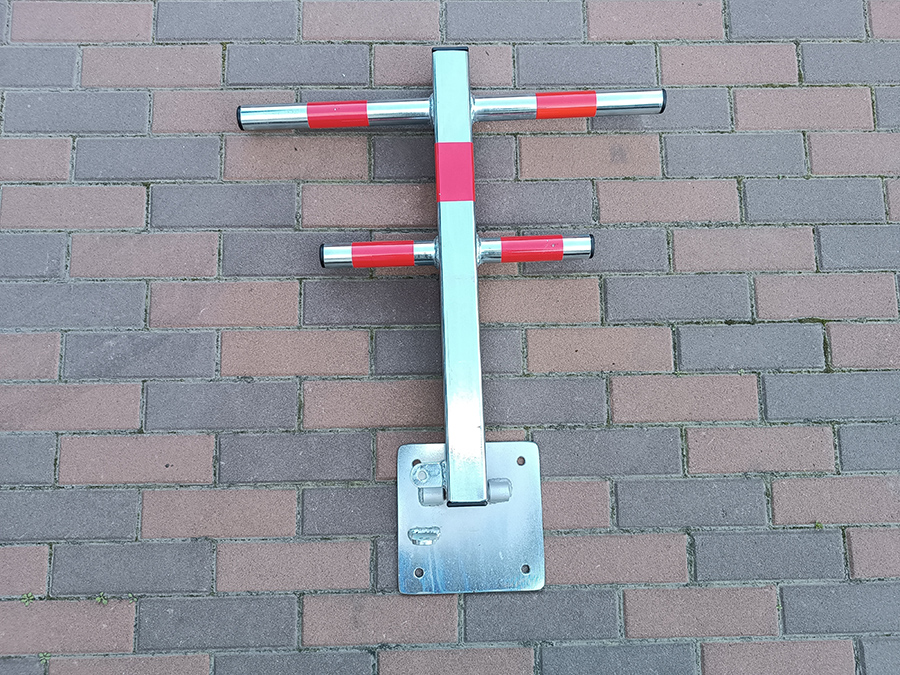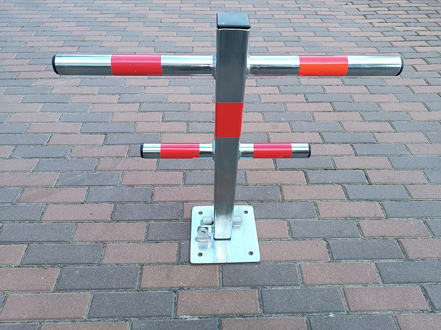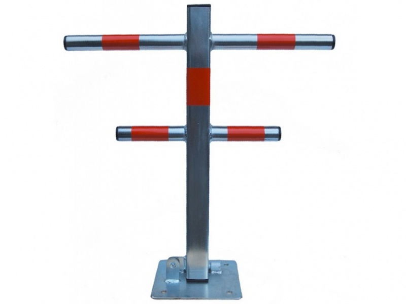 Парковочный Т-барьер под навесной замок. Имеет специальные бамперы для защиты конструкции во время сборки. Сделан из оцинкованной стали изготовленной методом гальванического цинкования на которую наклеены полосы из светоотражающей пленки, отлично отражающей свет автомобильных фар.