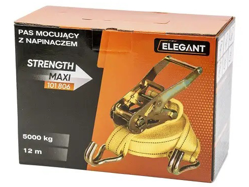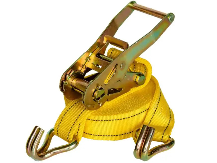 Стяжной ремень оборудован храповым натяжным механизмом и двумя металлическими крюками. Стяжная лента выполнена из высокопрочного текстильного материала. Выдерживает высокие постоянные и динамические нагрузки - до 3 тонн. Устойчива к истиранию, не растягивается. Обеспечивает надежное закрепление груза в процессе транспортировки, не повреждая его.