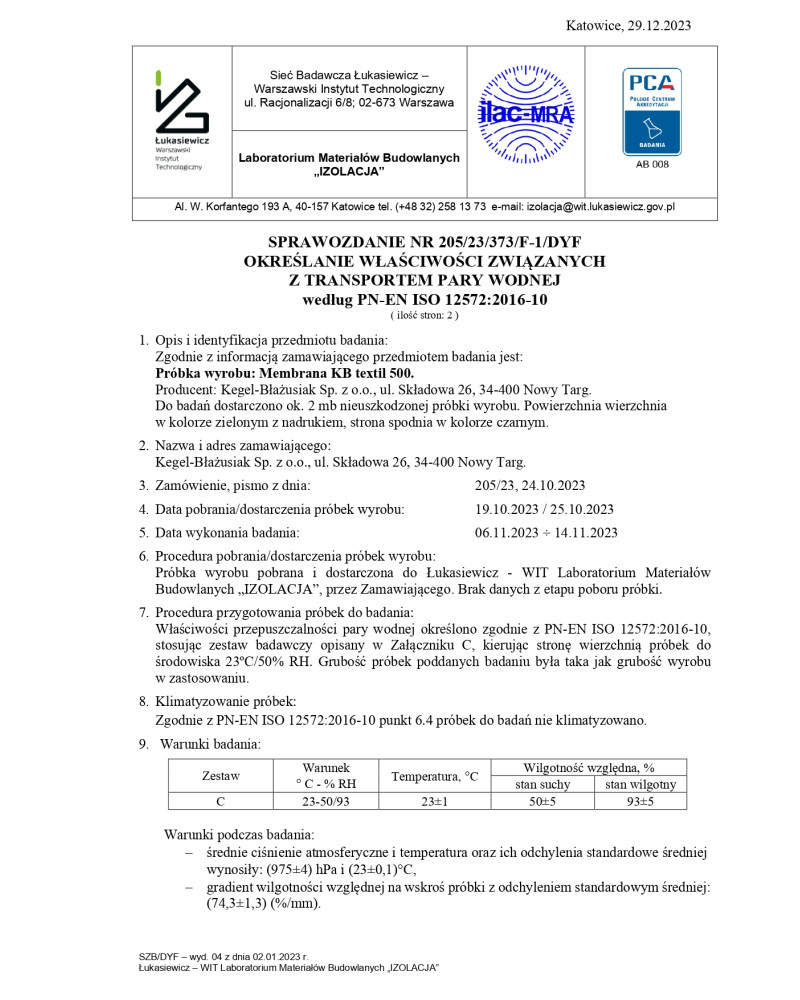 Ниже приведен отчет об испытаниях на паропроницаемость мембраны, из которой изготовлен тент Membranе Garage. Испытания проводились в независимой аккредитованной исследовательской лаборатории. Тест подтверждает высокую паропроницаемость мембраны с очень хорошим результатом 0,69 Sd и проникновением водяного пара через покровную мембрану на уровне 267,7 граммов водяного пара на м2 мембраны за 24 часа.