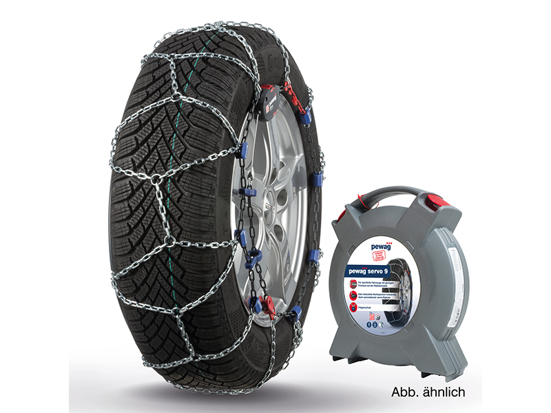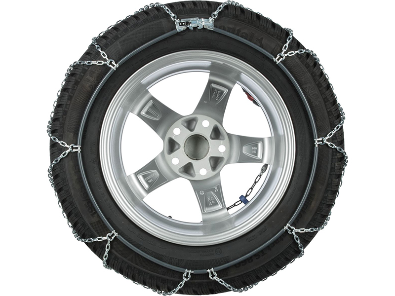 Диагональную сетку формируют прочные звенья, толщина их материала составляет 3.1 мм. Цепь легко снимается за счет внутреннего замка с автоматическим механизмом. Изготовление наружных деталей цепи из пластика или с защитными клипсами обеспечивает защиту дисков от повреждений и царапин.