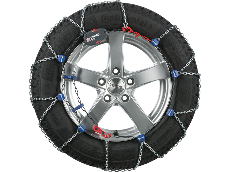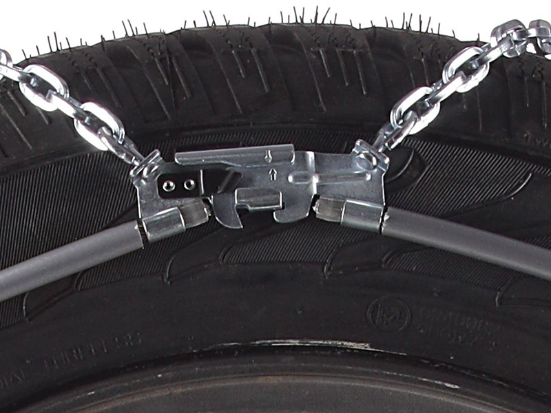 Диагональную сетку формируют прочные звенья, толщина их материала составляет 3.1 мм. Цепь легко снимается за счет внутреннего замка с автоматическим механизмом. Изготовление наружных деталей цепи из пластика или с защитными клипсами обеспечивает защиту дисков от повреждений и царапин.