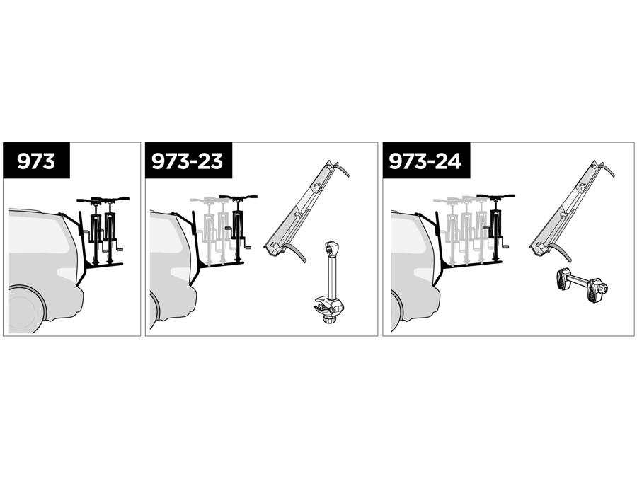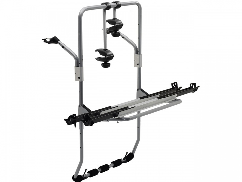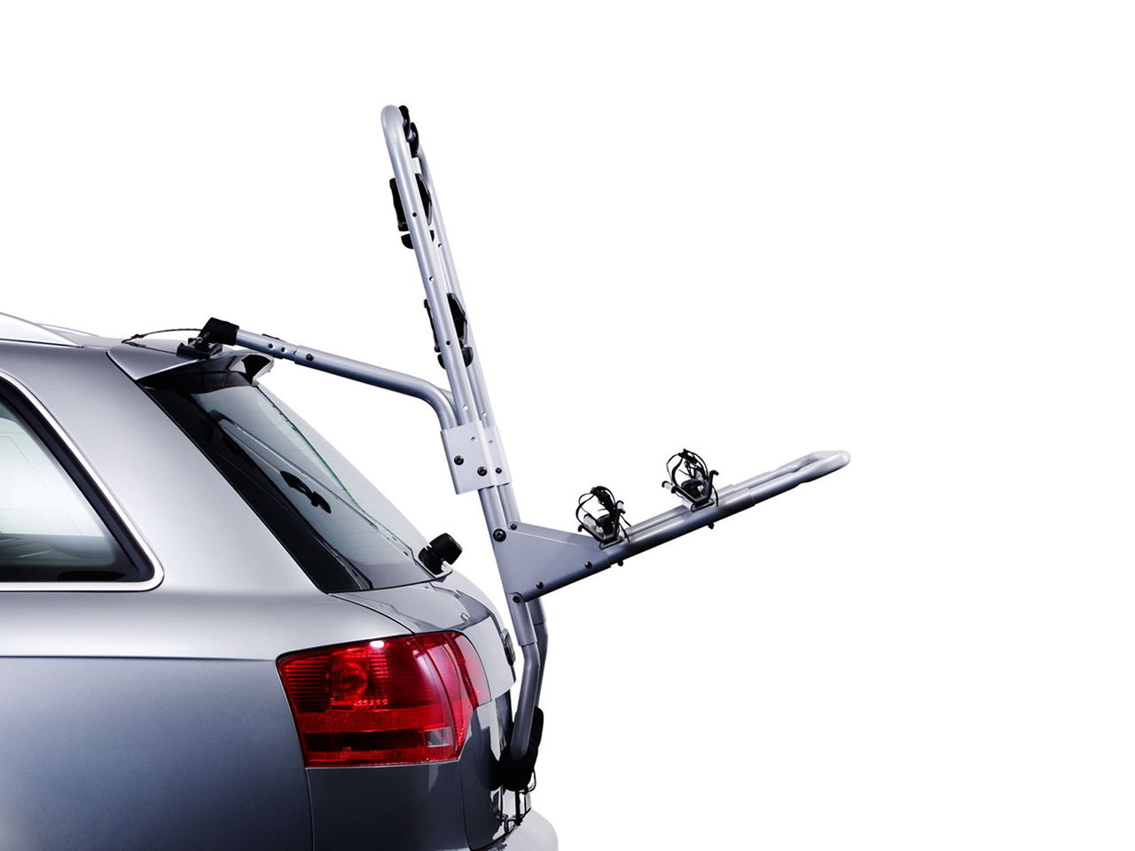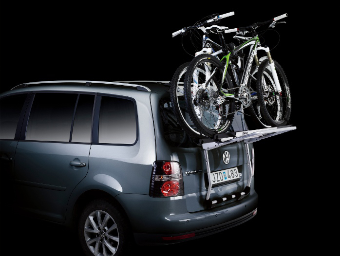 Багажник для перевозки 2-х велосипедов на задней двери автомобиля. Специальная модель для универсалов и минивэнов. Надежная и прочная модель, не закрывает задние огни и номерной знак. Подходит для большинства машин. Устанавливается на заднюю крышку автомобиля при помощи индивидуальных монтажных китов TH - 973-14 / 973-19 (монтажный кит в комплект не входит).