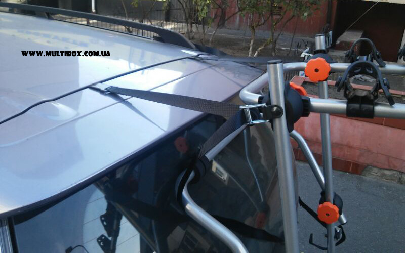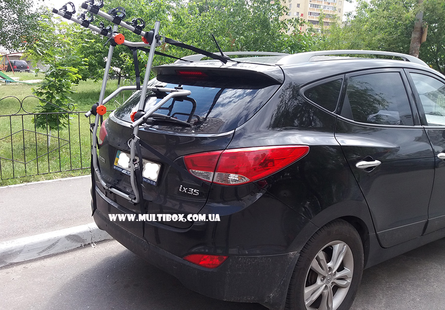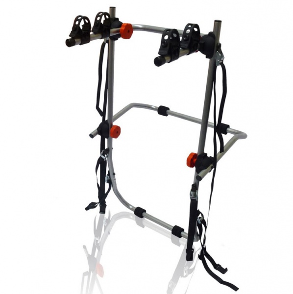 Крепление на заднюю дверь автомобиля для перевозки 2-х велосипедов. Изготовлено из 25 мм стальных труб для дополнительной прочности. Передвижные держатели рамы велосипеда дают возможность легко разместить велосипеды. Устанавливается без инструментов.
