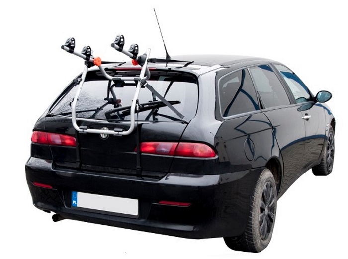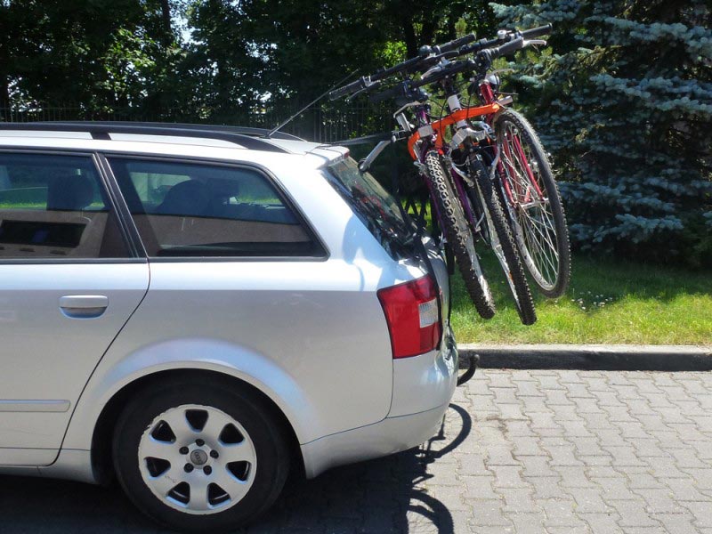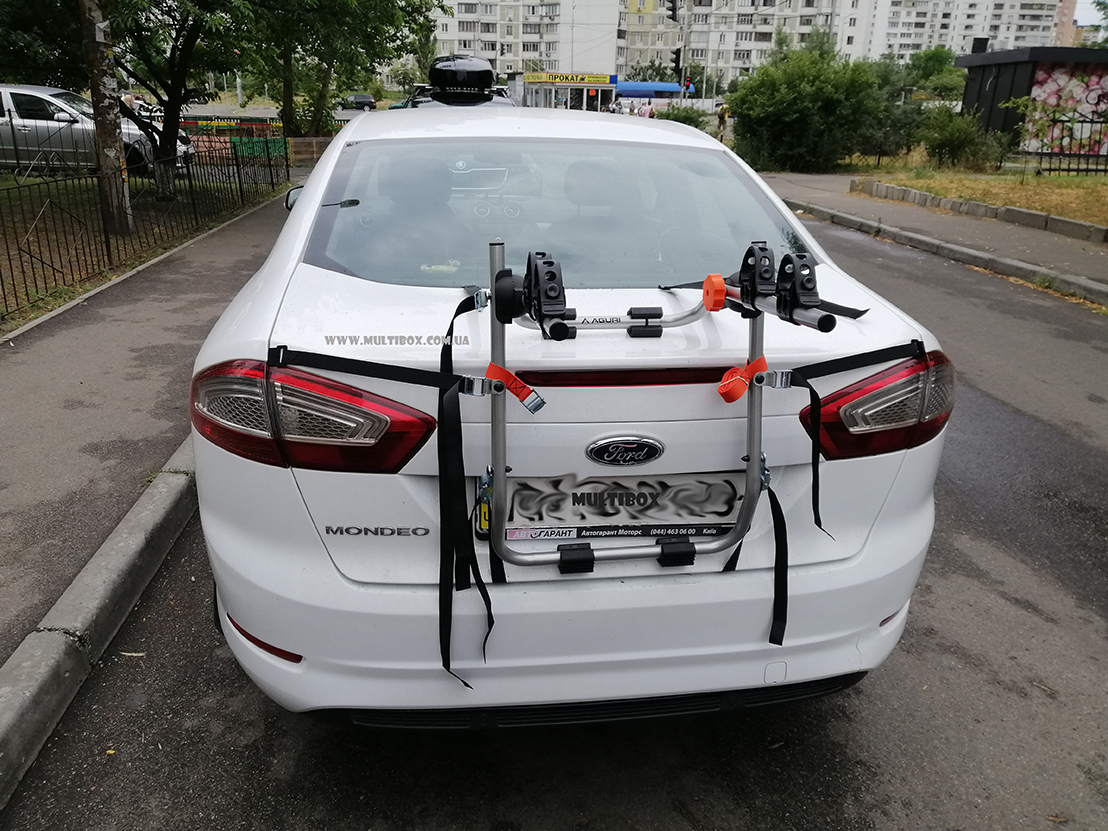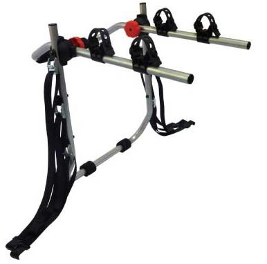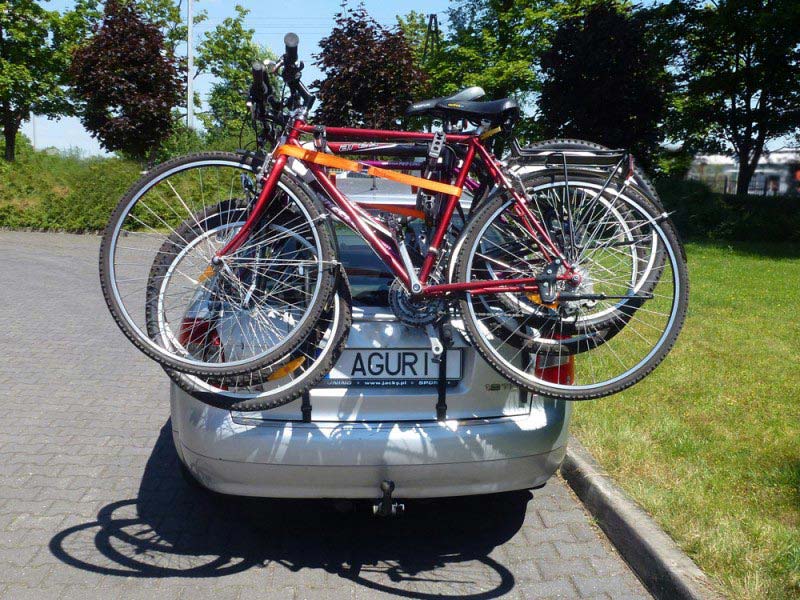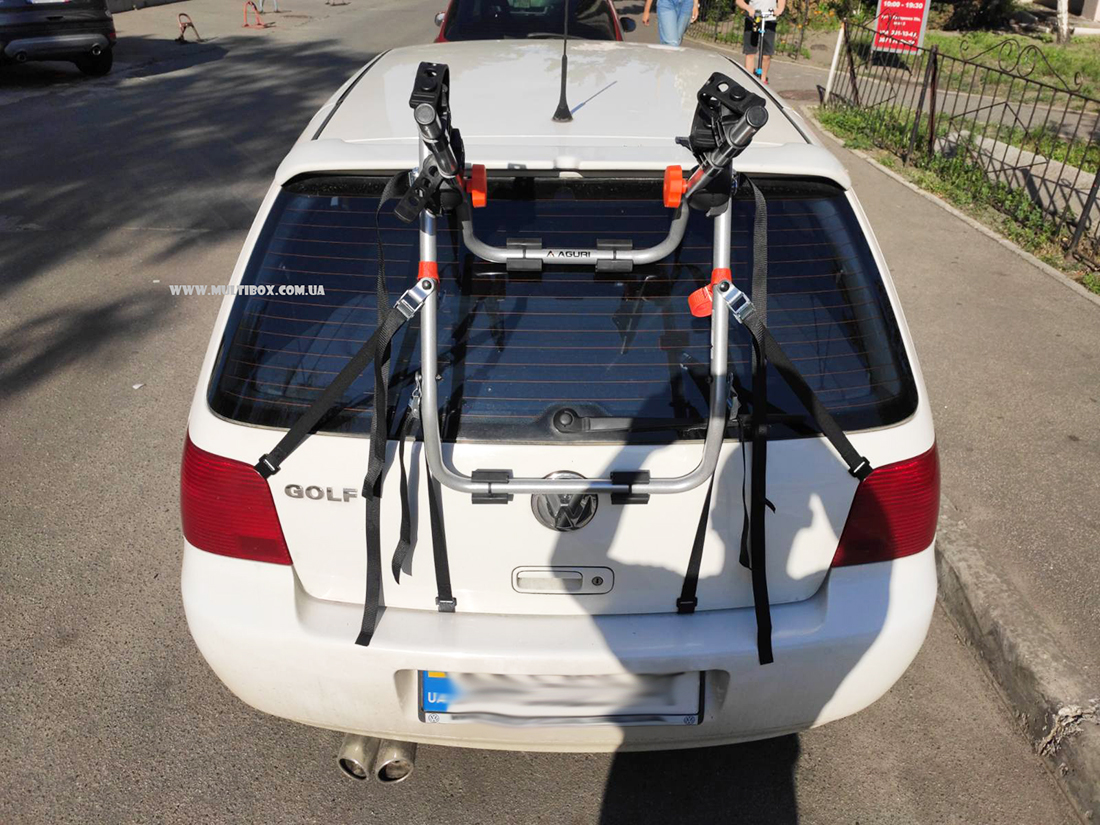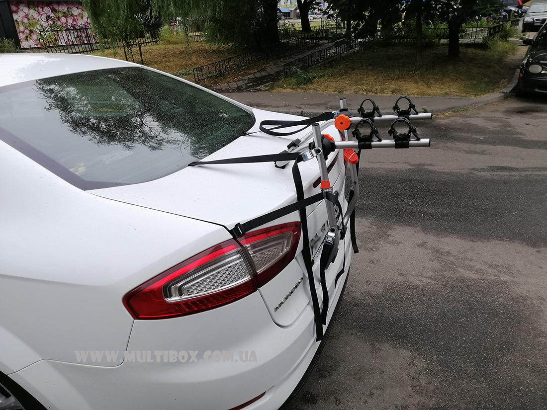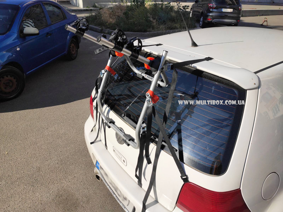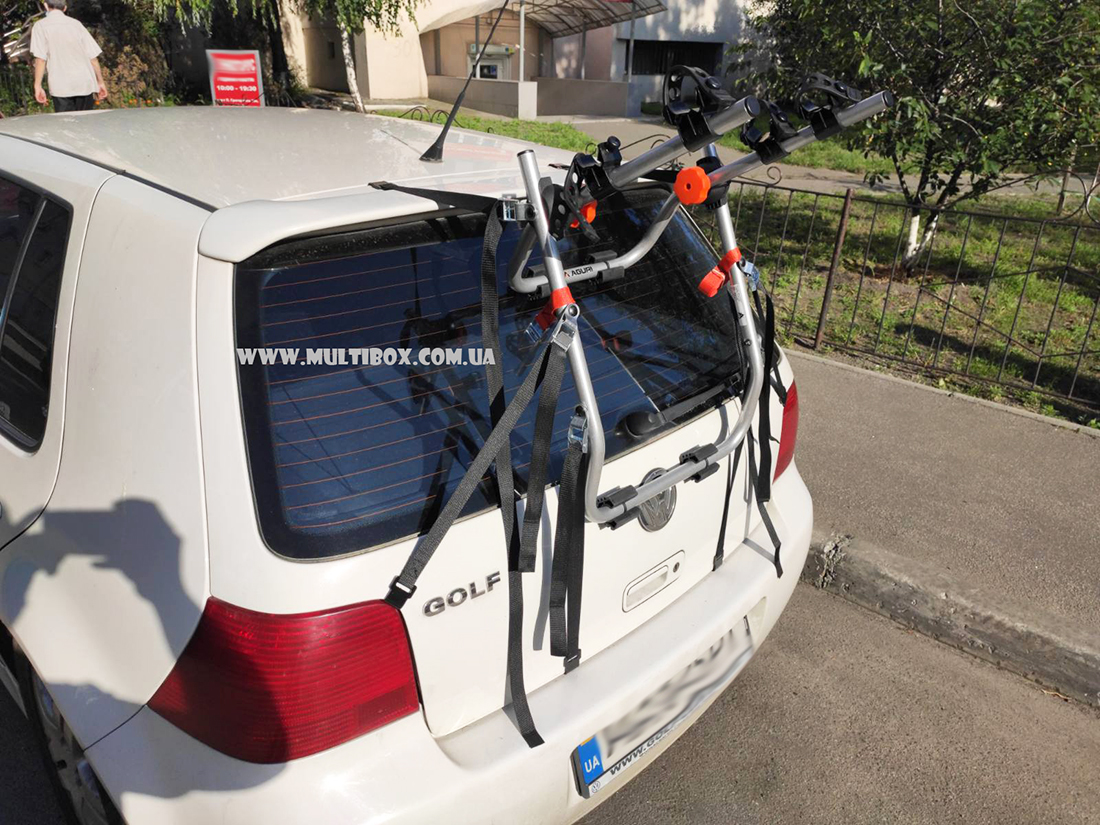 Крепление на заднюю дверь автомобиля для перевозки 2-х велосипедов. Изготовлено из 25 мм стальных труб. Порошковая покраска. Передвижные держатели рамы велосипеда дают возможность легко разместить велосипеды. Устанавливается без инструментов. Максимальная нагрузка 30 кг.