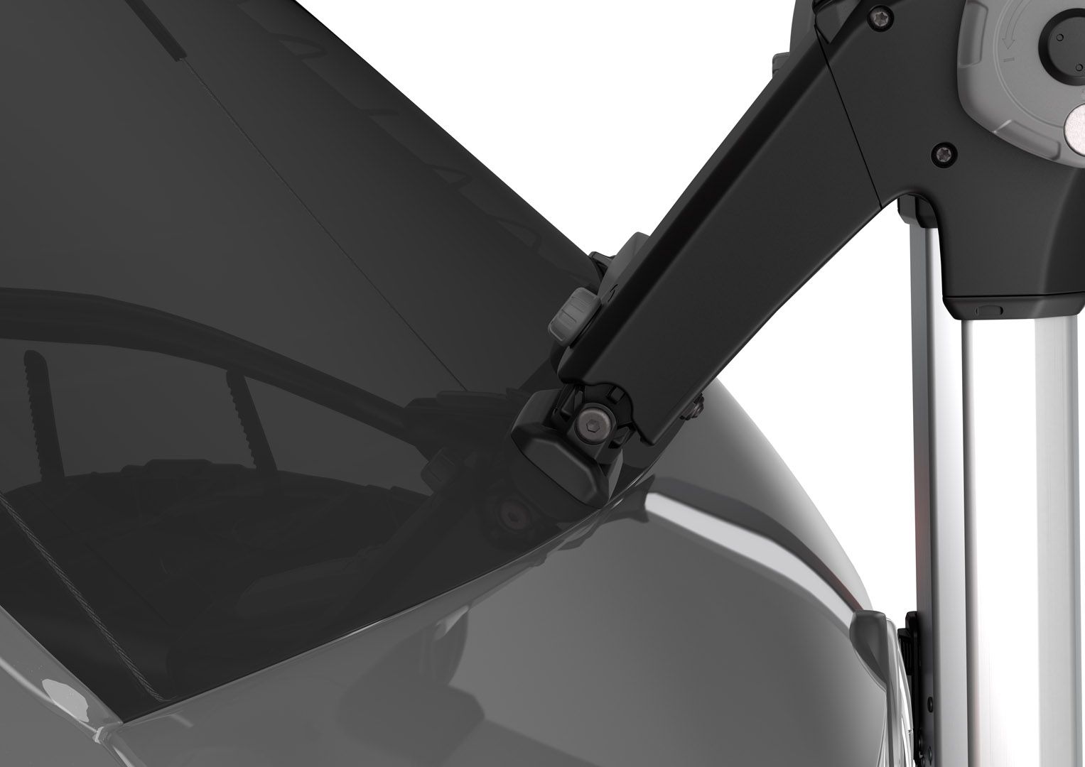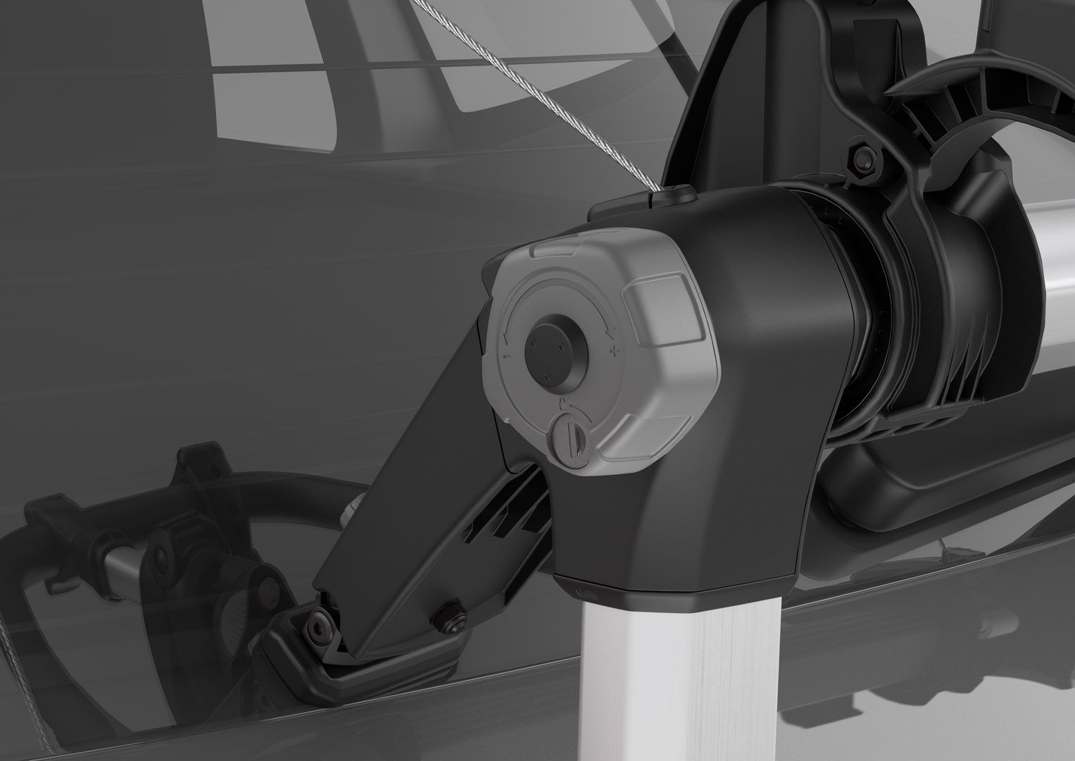 - Легкая установка велосипедов со съемными велосипедными держателями с фиксируемыми ручками ограничения крутящего момента Thule AcuTight, которые щелкают при достижении оптимального крутящего момента