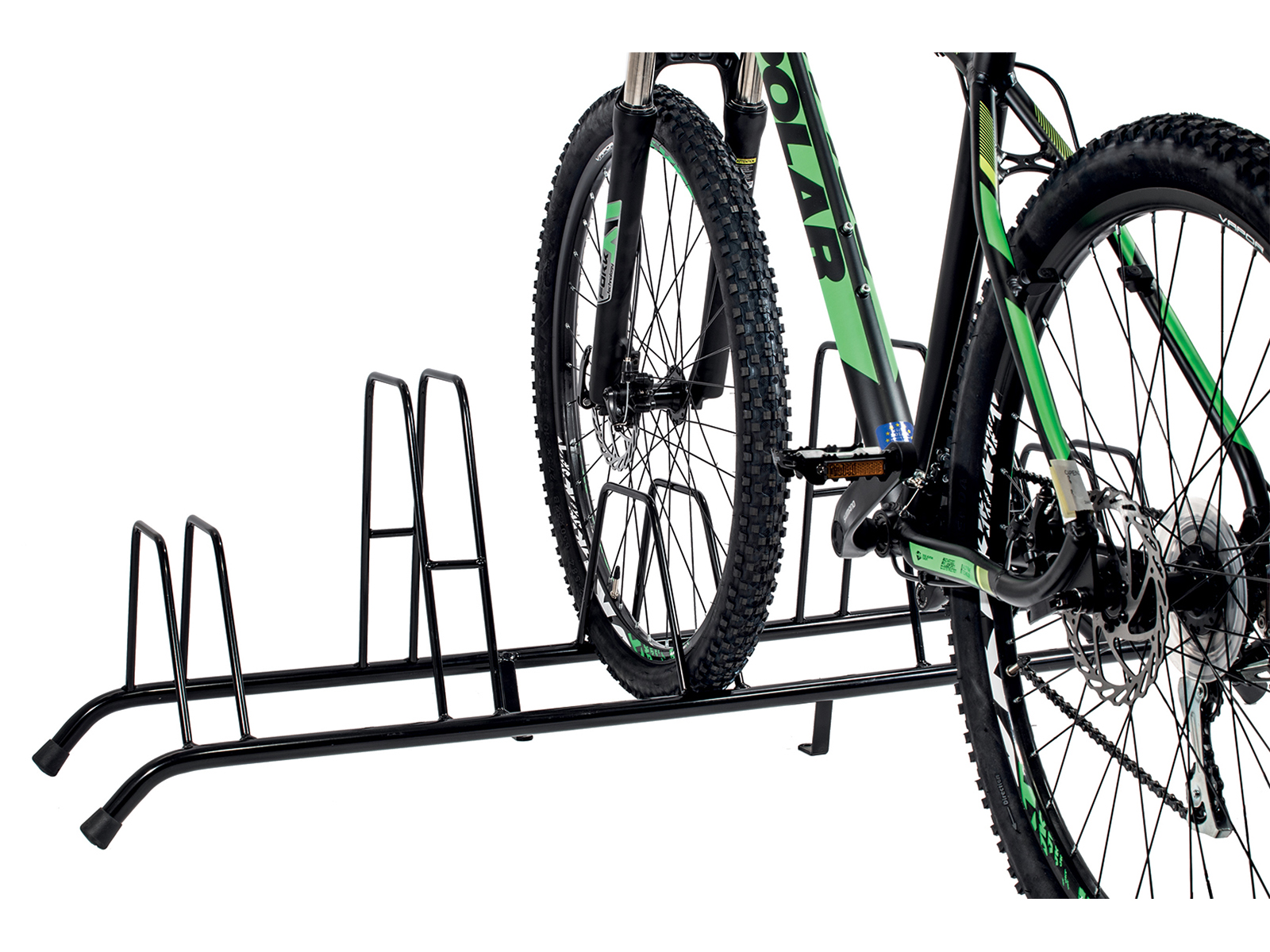 Напольный стенд для хранения-парковки велосипеда на ножках Peruzzo Floor Rack. Стенд для хранения велосипедов без контакта с полом. Держатели разной высоты позволяют избежать касания велосипедов рулями друг с другом.