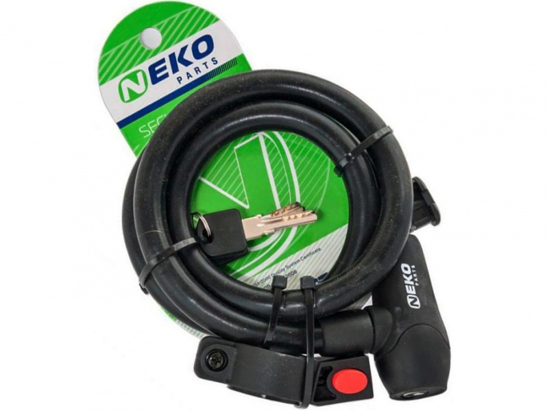 100 - сантиметровый трос c замком, защищенный резиной. Запирает практически любой инвентарь. Толщина - 10,5 мм. Закрывается ключем.