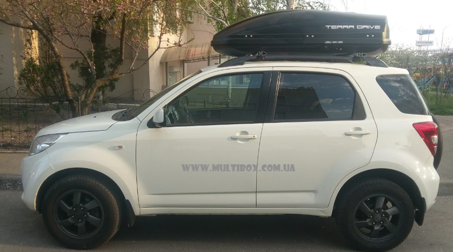 Автомобільний бокс Terra Drive 440 black DS на Daihatsu Terios з двостороннім відкриттям, чорний, матовий, встановлений на недорогі поперечки Amos Wind Futura. За кольором дуже красиво виглядає з чорними дисками.