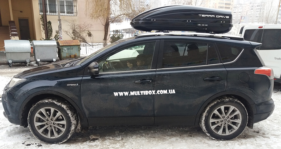 Для перевезення лиж і сноубордів на машині з рейлінгами Toyota RAV4 прекрасно підійде Terra Drive 440 DS чорний глянець, встановлений на поперечки Агурі Престиж.