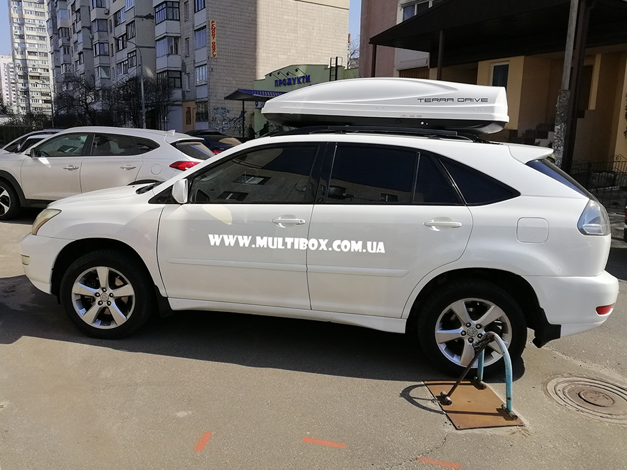 Автомобільний бокс Terra Drive 480 білий глянцевий, двосторонній на дах автомобіля з оригінальними поперечинами Lexus RX. Кришка багажника відкривається і не дістає до боксу.