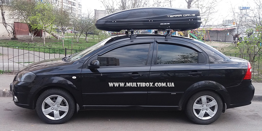 Клієнт думав гадав чи підійде на його авто довгий бокс. Приїхав, приміряли і поставили автомобільний бокс на дах Terra Drive 480 чорний двосторонній на поперечинах Кенгуру Camel (Камел) Алю.