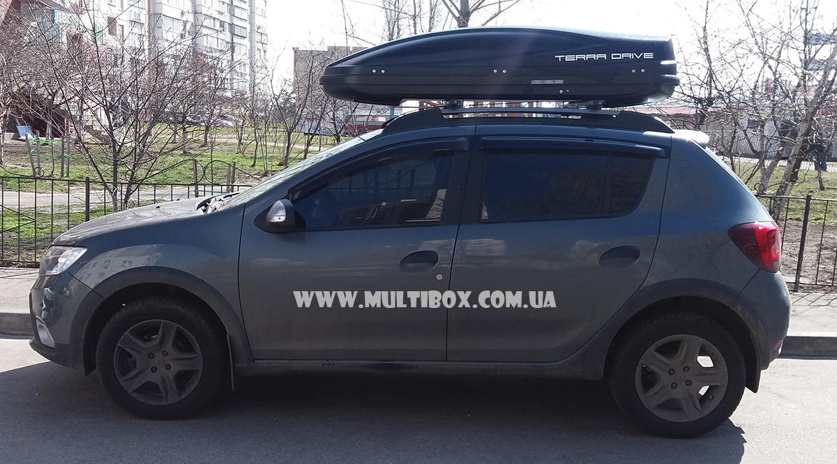 Встановлення боксу Terra Drive 480 DS на дах автомобіля Renault Sandero StepWay з рейлінгами на поперечки AutoMaxi 190.