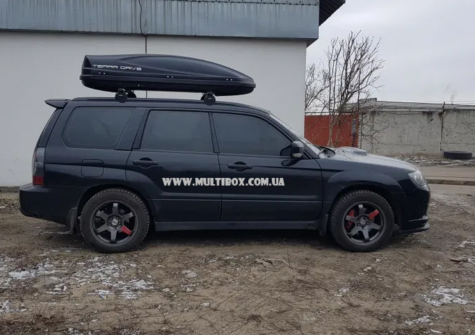 Автомобільний бокс на одну з найпоширеніших машин Subaru Forester, шикарно стає, не виступає і не маленький, гармонійно вписується в дизайн авто - це найпопулярніший в Україні бокс на дах Terra Drive 480 довжиною 196 см.