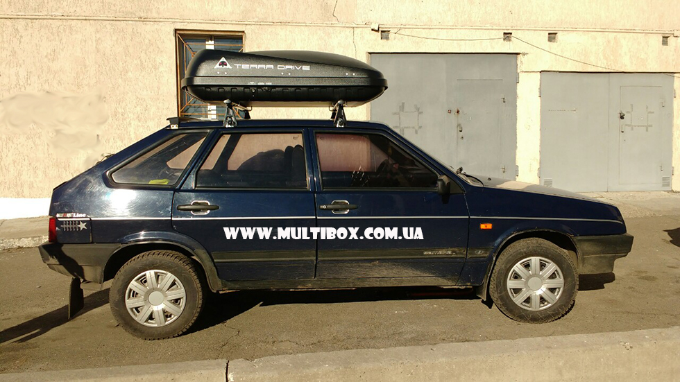 Класичне авто Лада 2109 з двостороннім боксом Terra Drive 420 DS, збільшилося місце для речей на 420 літрів. Встановлений на багажник Кенгуру УНІ Алю на водостік.