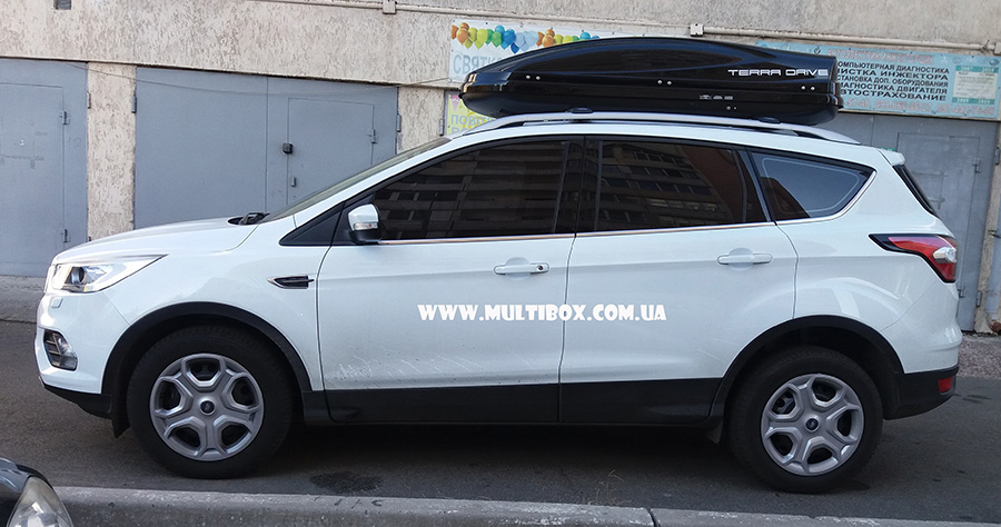 Білий Форд Куга з тонованим склом, поставили Чорний глянсовий Terra Drive 480 DS, на поперечки, що не стирчать по краях Whispbar S-Wing.