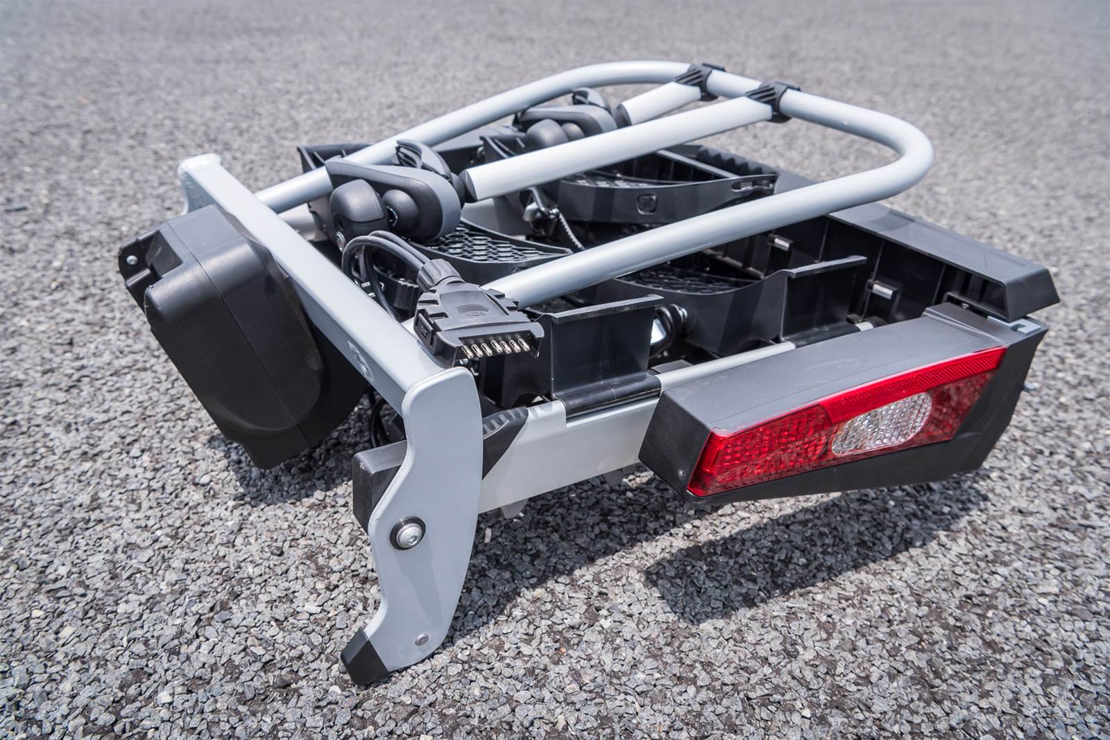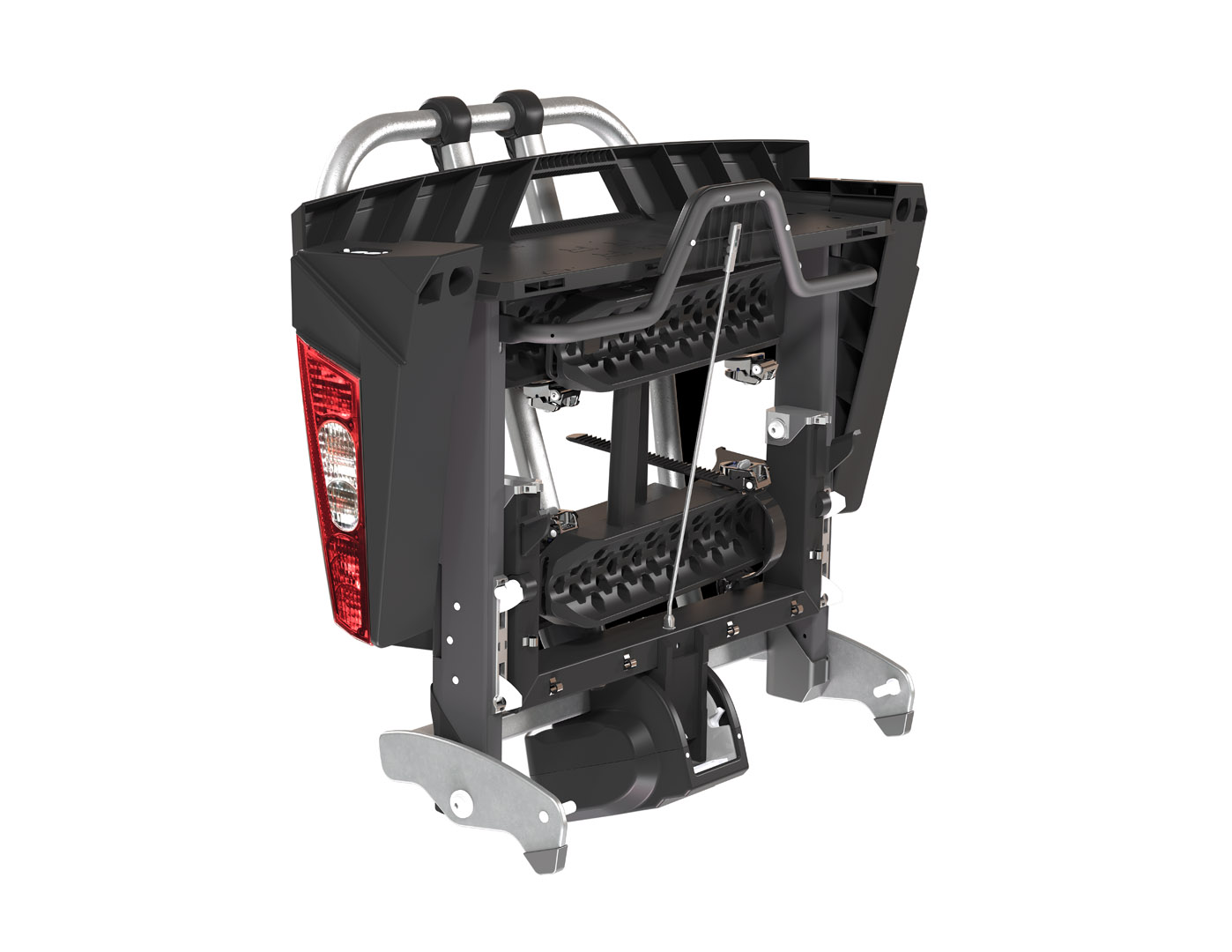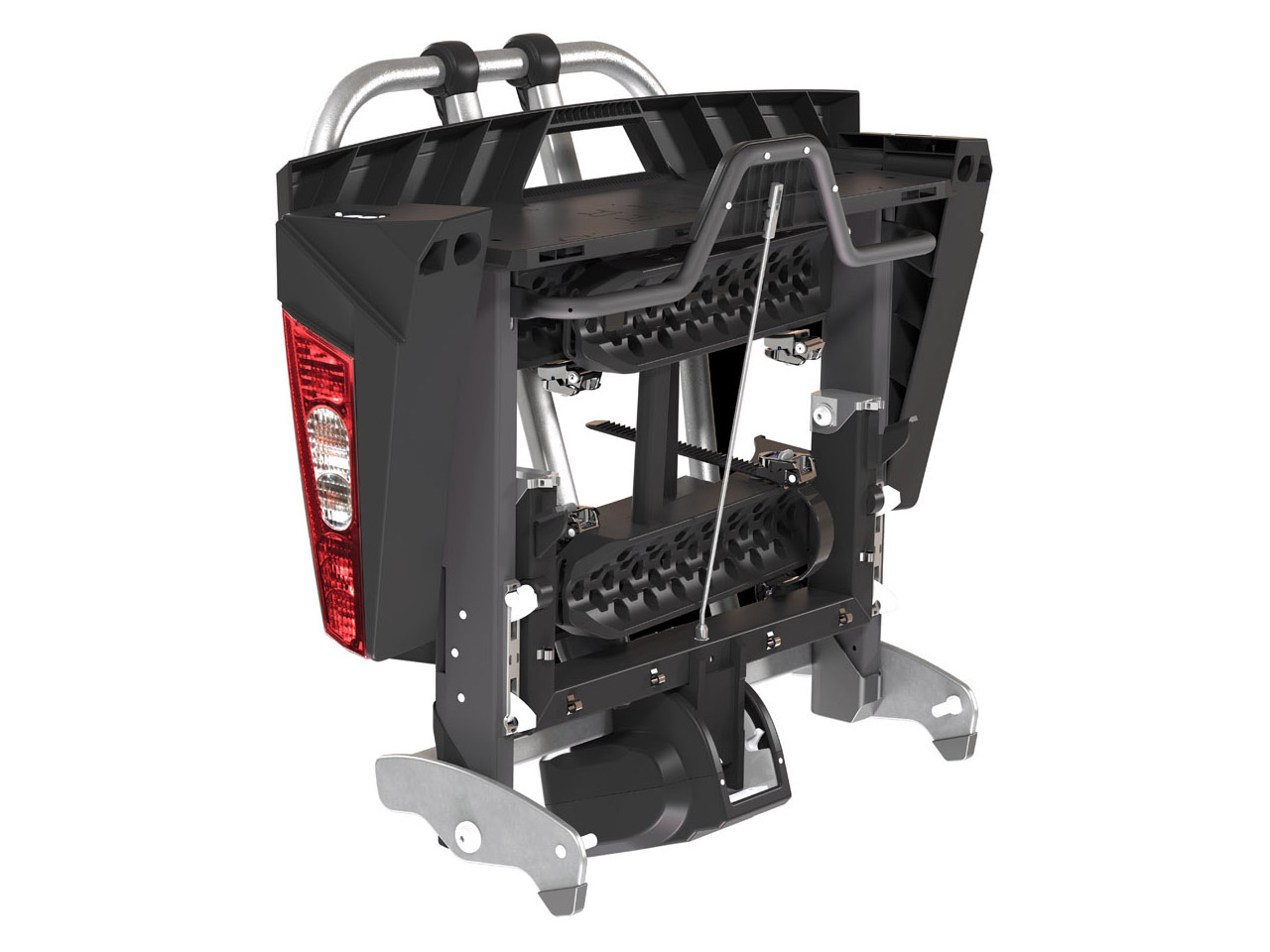 Складне велокріплення на фаркоп для 2 велосипедів. Проста система Just Click дозволяє легко і безпечно встановити кріплення на фаркоп вашого автомобіля. Його козирем є можливість скласти конструкцію, щоб займати якнайменше місця під час зберігання.
