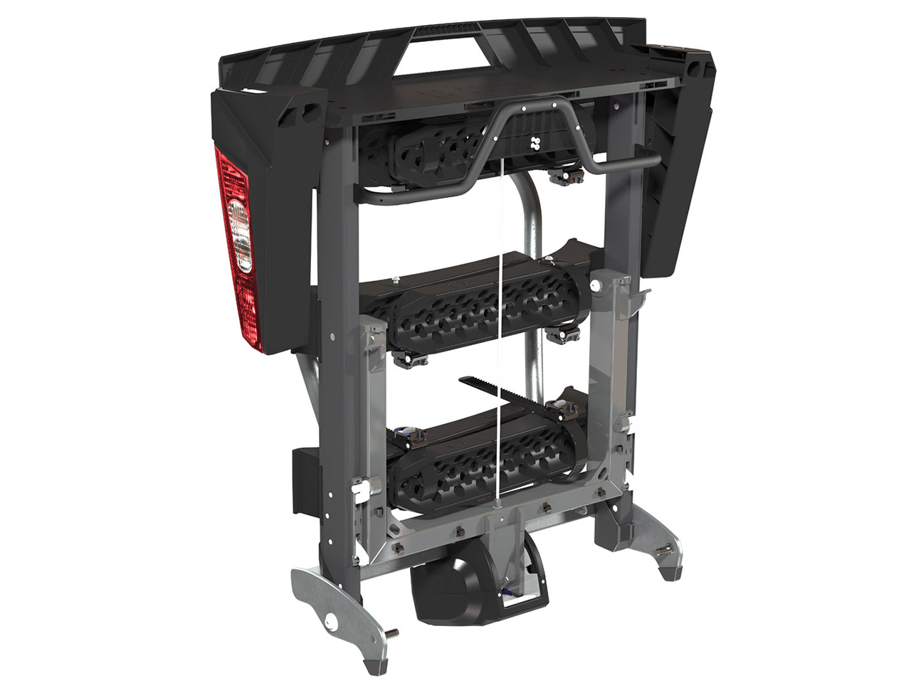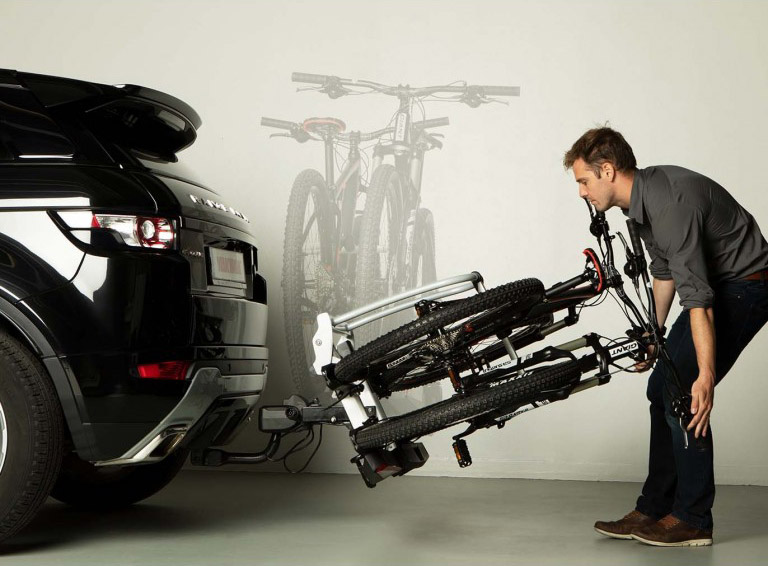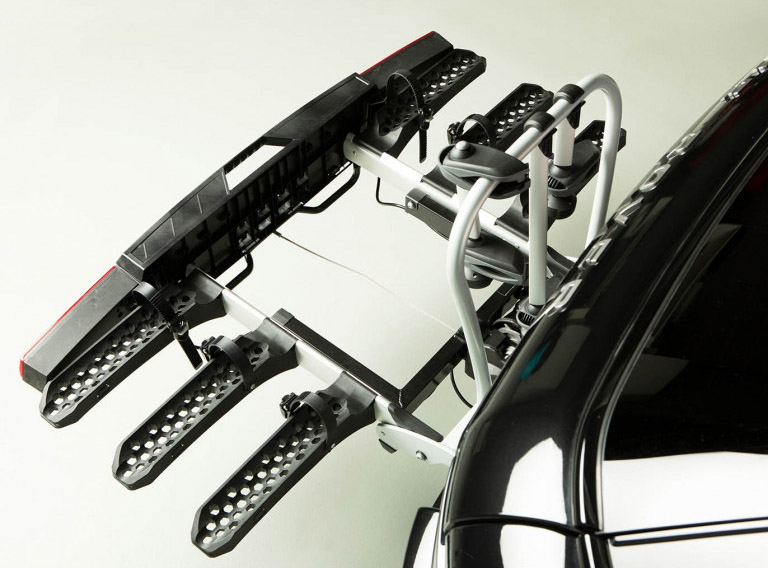 Складане кріплення для 3-х велосипедів. Проста система Just Click дозволяє легко і безпечно встановити кріплення на фаркоп вашого автомобіля. Його козирем є можливість скласти конструкцію, щоб займати якнайменше місця під час зберігання.