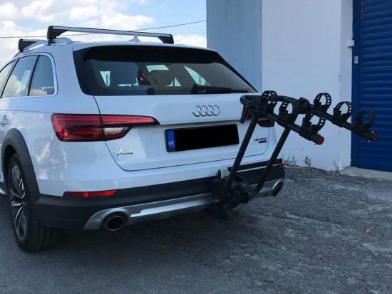 Складане кріплення для перевезення 3-х велосипедів на фаркопі. Має функцію швидкої фіксації на кулі фаркопа та зручну функцію нахилу за допомогою педалі. Закривається на замок на фаркопі.